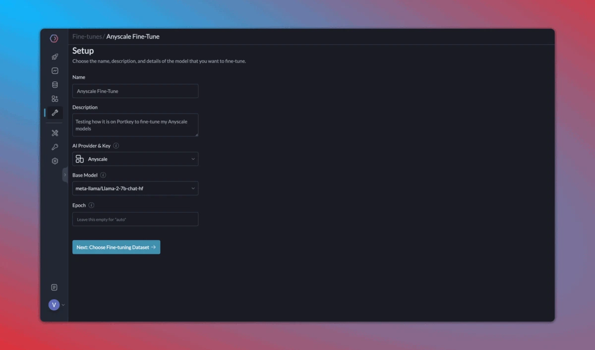 Once you start logging your requests and their feedback with Portkey, it becomes very easy to 1️) Curate & create data for fine-tuning, 2) Schedule fine-tuning jobs, and 3) Use the fine-tuned models! Fine-tuning is currently enabled for select orgs - please request access on Portkey Discord and we’ll get back to you ASAP.