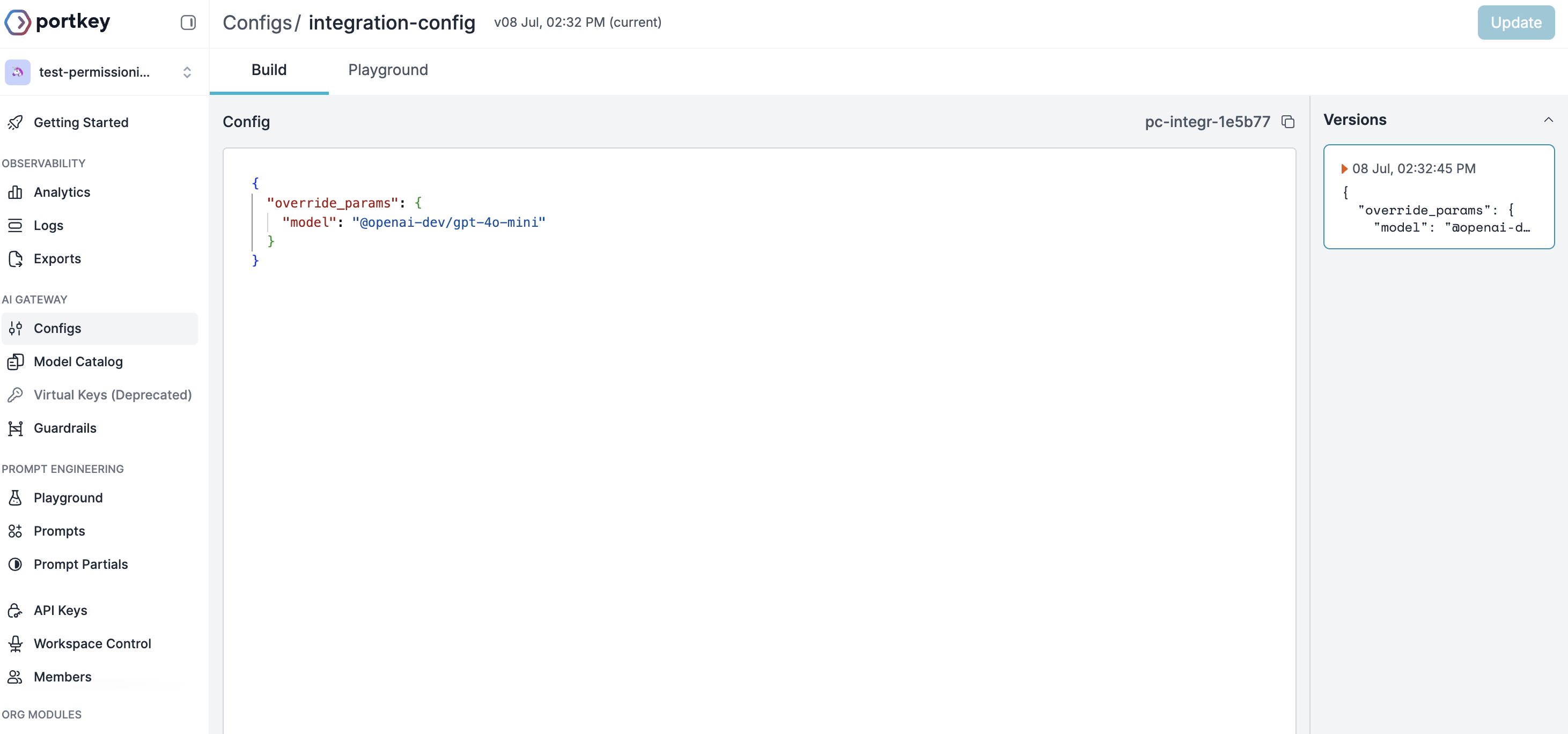 Portkey’s config is a JSON object used to define routing rules for requests to your gateway. You can create these configs in the Portkey app and reference them in requests via the config ID. For this setup, we’ll create a simple config using your provider (OpenAI) and model (gpt-4o).