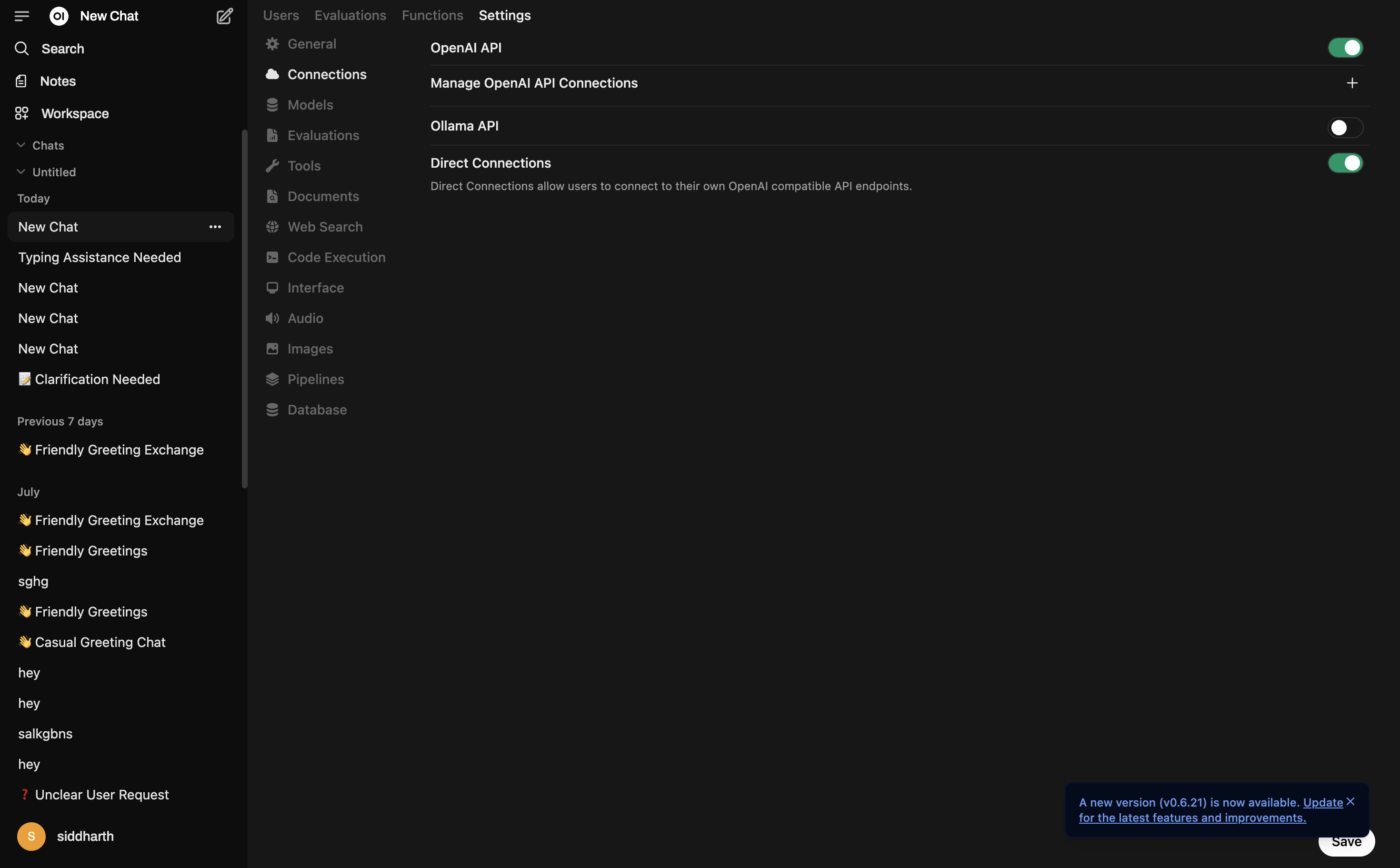 - Turn on Direct Connections and the OpenAI API toggle.