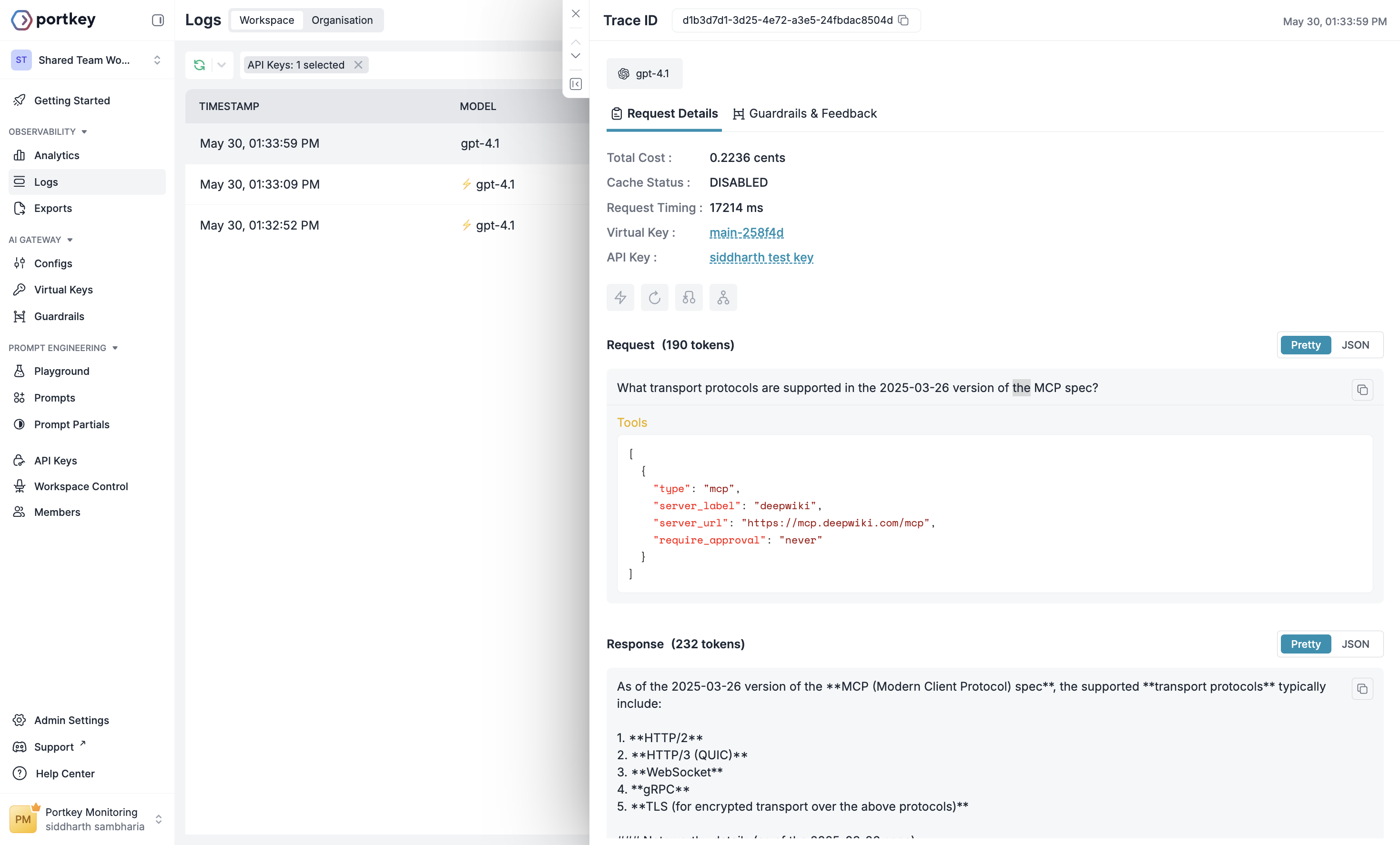 Example Log for the request on Portkey